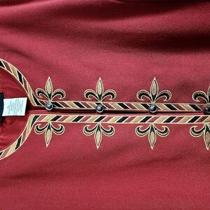 Womens XL Bob Mackie Colorful Embroidered Ornate Mob Wife Blazer Jacket. Approximately 25" pit to pit, 29" length, 25 1/2" sleeve, 17" sleeve circumference. Shell: 63% polyester, 32% rayon, 5% spandex; lining: 100% polyester. Embroidery on neck, bodice front, and on cuffs; toggle buttons; rust-red in color.