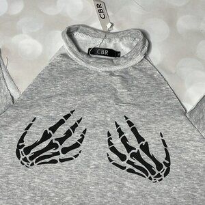 Womens XL Gray CBR Skeleton Hands Cut-Out Shoulder Long Sleeve distressed Top
