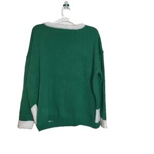 This Women's XL Ugly Christmas Sweater features a fun and festive design with a green llama wearing reindeer antlers and Santa. accented with green sequins, jingle bells, glitter, and fringe. The sweater is in a geometric pattern with a crew neck and long sleeves, perfect for the holiday season. The graphic print adds to the playful and whimsical look of the pullover sweater from 33 Degrees, making it a standout piece in any woman's wardrobe.