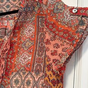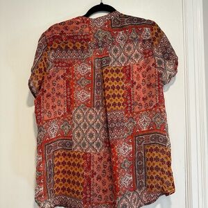Women’s XL Westport Red Paisley Multiple Pattern Short Sleeve Peasant Blouse. Small pleats near button toward collar. Mock collar. Raglan cut button sleeve. Crushed chiffon feel.excellent used condition. No rips, stains or defects. Please see pictures for measurements.