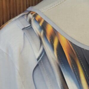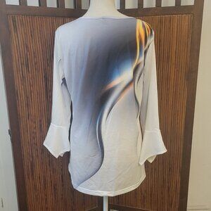 Womens XL White Blue Button Neck Pullover Stretch 3/4 Flair Sleeve Blouse Unworn