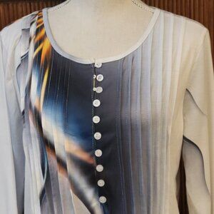 Beautiful Flattering Watercolor blouse. The half button up neck and pleated accents create a bohemian vibe, which accents the smallest part of your body (under the breast)!