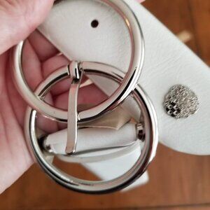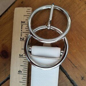 Women's XL Wide Vegan Leather White Belt, Faux, Silver tone Double Circle Buckle