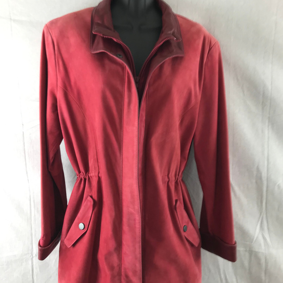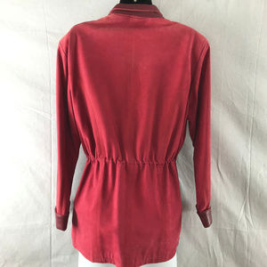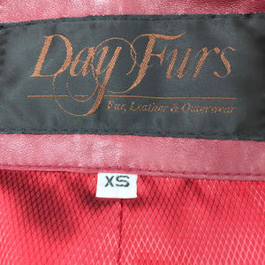 Day Furs Womens Leather Drawstring Coat Jacket Red Lined Pockets Full Zip Size XS Drawstring, Zipper, inside Pocket, Outside Pockets, Snaps, Drawstring at waist, Slimming, Drawstring inside on waist, Pockets, Mint Condition