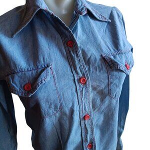 Women's XS Vintage Denim Shirt 1970's Button-Up Red Buttons Distress Boho Hippy