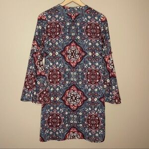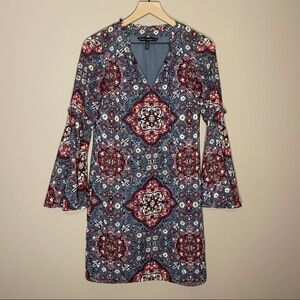 Women's XS WHBM Medallion Print Shift Dress Bell Sleeve 70's style Blue Red Plum