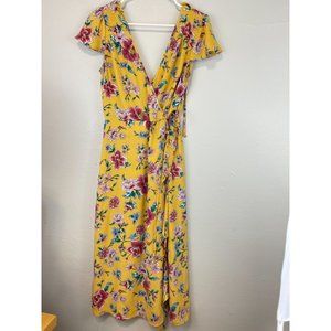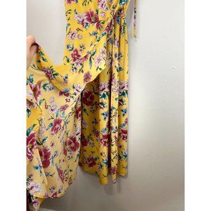 Women's Xhilaration Small Maxi Dress Floral Yellow V-neck Ruffle Polyester S/S Side Slit 23