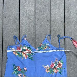 Stylish blue jumpsuit with floral print. Sleeveless design. Perfect for casual outings.