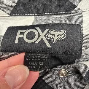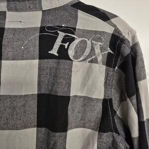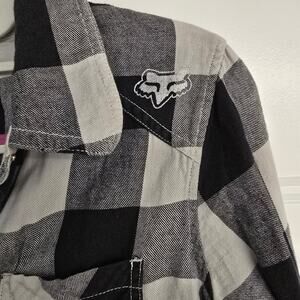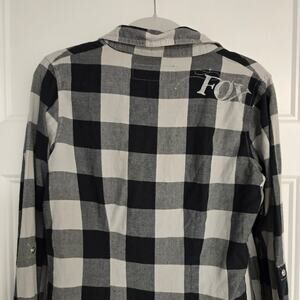 Excellent condition, women's Fox black and gray flannel, snap front, long sleeve top. This top has roll tab sleeves and a rounded bottom. This material doesn't stretch.