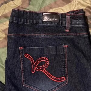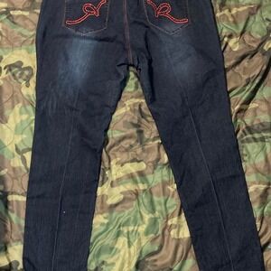 Women's Y2K Rocawear embroidered embellished jeans size 42. Women's Rocawears in an uncommon size. If this is your true size it's more like a straight cut, if you're going for a more oversized look these are the king of jeans that taper closet to the ankle and allow the rest of the leg to stack on top of it. Dark blue was denim with red contrast stitching and Rocawear Rs on the back pockets. Inside of R embroidery has gems. Gems are all present. Little Rocawear back patch. No rips or stains