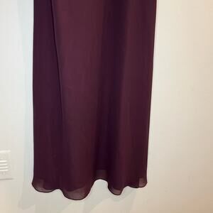 Plum colored, High neck, velvet pattern, A-Line, formal dress. Fully lined, hidden zipper in back.