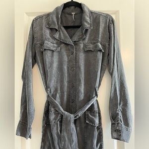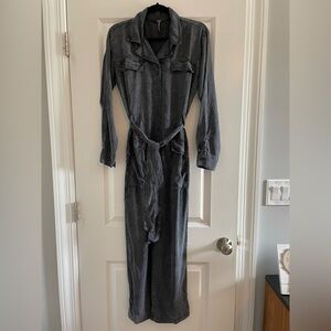 Womens YFB utility jumpsuit in black wash. NOT in white like stock photo. Pockets in front and one back pocket with a Utility pocket. Elastic back waistline. Comes with tie belt. Back of hemline has a belted adjustable strap. Like new. Size XS.
