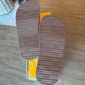 Signature Yellow Box EVA flip flop with wide, woven straps with frayed edges for a casual boho look that is comfortable to wear all day long.