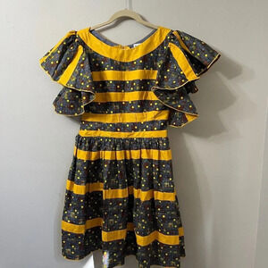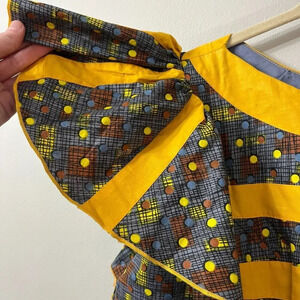 Womens Yellow Gray Polka Dot Ruffle Mini Dress Short Ethnic Tribal S/M Handmade