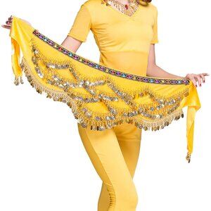 Women's Yellow Triangular Belly Dancing Hip Scarf Wrap Skirt with Gold Coins