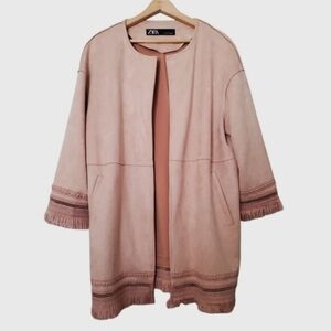 Women's Zara jacket faux suede with fringe detail and 3/4 length sleeves is size M medium. Open front style coat is a dusty rose color with 2 front pockets. Fringe detail is all around the bottom hem and both cuffs. Inside care tag has been removed as shown in last photo. Gently used pre-loved condition with no rips or stains. Comes from a smoke free home.