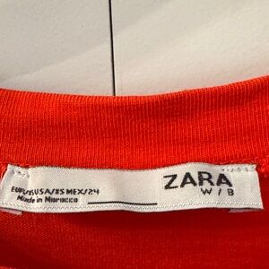 Eye-catching red tee with playful ruffles. Ideal for casual or chic looks. Small hole around collar line. Hardly noticeable, but price reflects the defect.