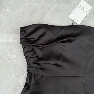 Brand new with tags - Women’s Zara Strapless Satin Side Effect Asymmetrical Mini Dress. Has some ruching on one side of bust area and zipper closure on the other side. Colors: black. Size: S.