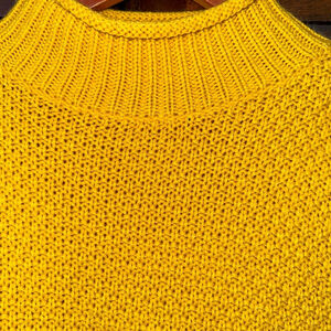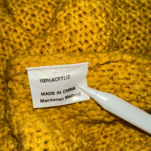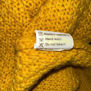 Pre-owned Zesica brand women's size M mustard yellow knit sweater. The sweater is made of 100% acrylic and features a mock neck, long sleeves, and a relaxed fit. It measures approximately 24" across the chest and 26" in length. The knit is textured with a honeycomb pattern. The sweater shows no significant flaws or damage; it is in good condition. Care instructions indicate machine wash at 30°C, hand wash, do not bleach, and steam iron are acceptable. Made in China.