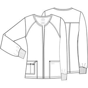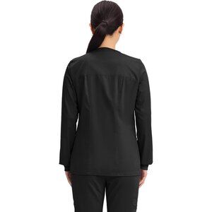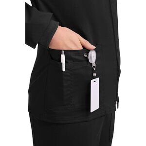 Features: Modern classic fit in a versatile black with a flattering shape. This scrub jacket is designed with a zip front, a round neckline, and tonal knit cuffs for a polished look. It offers a snug, stretchy feel thanks to its 55% cotton, 42% polyester, and 3% spandex fabric blend. The back yoke and princess seams ensure a slimming fit, while the three pockets — including a sectional pocket with an ID loop — provide plenty of storage for medical tools, phones, and essentials.