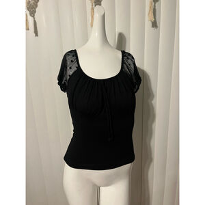 This is a pre-owned black top from Ambiance, size medium. It features a scoop neckline with a gathered bust and a decorative tie. The short sleeves are made of sheer black fabric with polka dots. The body of the top is a fitted knit material. There are no visible stains or tears. The garment is made in Cambodia.