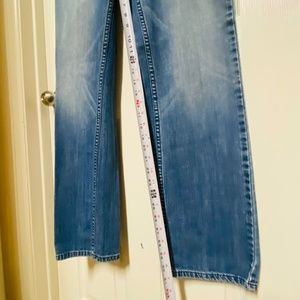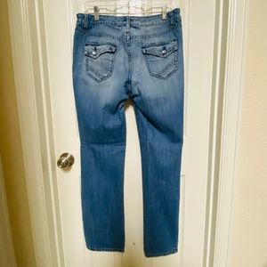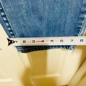 Light blue denim with rounded crystal accents on the closing button and rivets. They fit snug on the ankles and look great with flats. Gently used, always washed in cold water, hung dry, then ironed, no flaws. Please see photos for approximate measurements. Inseam 31 in.