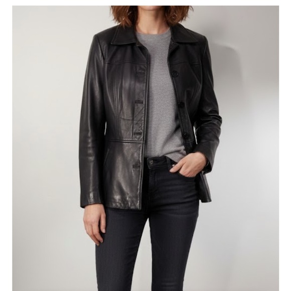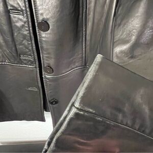 Elevate your style with this sleek black leather jacket. Perfect for any occasion, it offers a timeless look and comfortable fit. Jacket in very good used condition. Only visible signs of wear are edges of the sleeve cuffs. (As shown in photos.) very stylish with a vintage look (beautiful, soft leather).