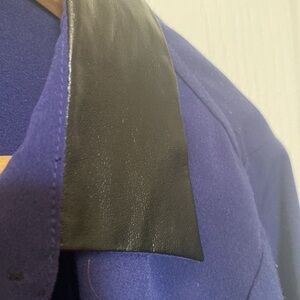 Has the leather look trim at the collar and cuffs button up front has the hidden Tab