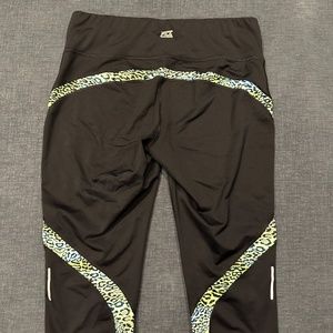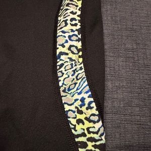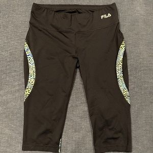 Women's athletic capri leggings, moisture wicking material. Blue & green leopard print on the sides. *tag with size was cut out, compared to other Fila leggings I own*