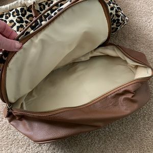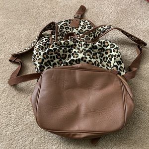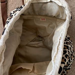 Womens animal woven cloth backpack with pleather trim. Has a zippered compartment at the bottom. Drawstring closure with a flap that magnets close. Small magnet closure front pocket. Used a couple times.