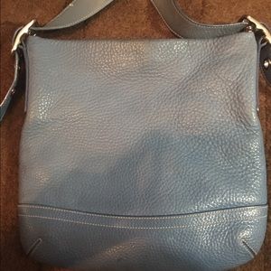 Color is as seen in photos (would describe as a greyish/blue). Excellent condition. Full zipper closure. Bought at retail for $228 . Interior is cloth with signature "c" logo. Strap is adjustable