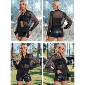 Womens black Sheer Mesh Sparkly Crop Bomber Jacket Glitter Rave Outfit