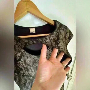 Women’s dress size small (tags missing) made by Carolina and made in the USA black with gold. Stretchy fabric with a fitted cut. Measurements are length 31” pit to pit 15” and waist 13”. Very elegant and perfect for cocktail party or formal outing.