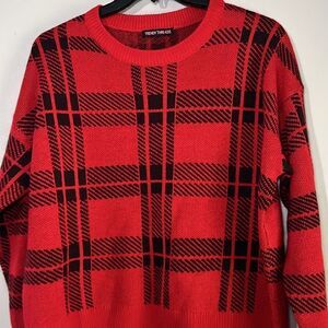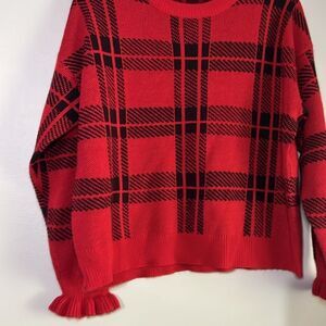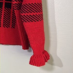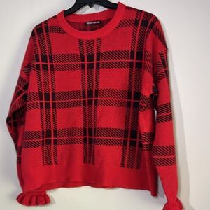 Women’s black and red plaid sweater with ruffle trim sleeve