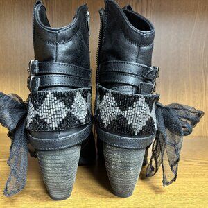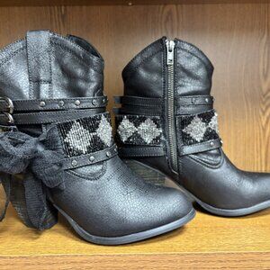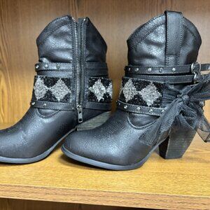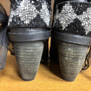 Great condition for pre-owned this pair of black ankle boots are women's size 6.5 medium. They feature a 3 inch heel and side zipper. The material is faux leather (PU) with a double strap and two buckle around the boot. There are black and silver beads on the front and side with a black bow on the side. As seen in the pictures there is some wear on the heels but not major.