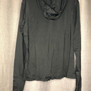 This black lightweight jacket is designed to protect you from UV. It is size 16 plus made of 88% Nylon, 12% Spandex and added with cool tech to the cooling. It features thumb, ponytail, and watch hole for extra comfort and convenience. It has two zippered pockets outside, two pockets inside