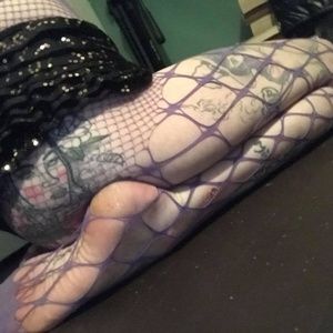 Women's black panties with gold glittery dots, Purple fishnet stockings are sold with it. Size Small
