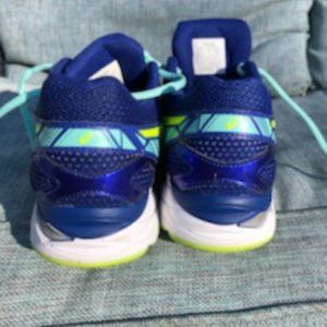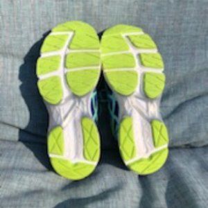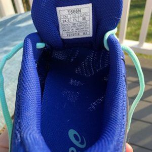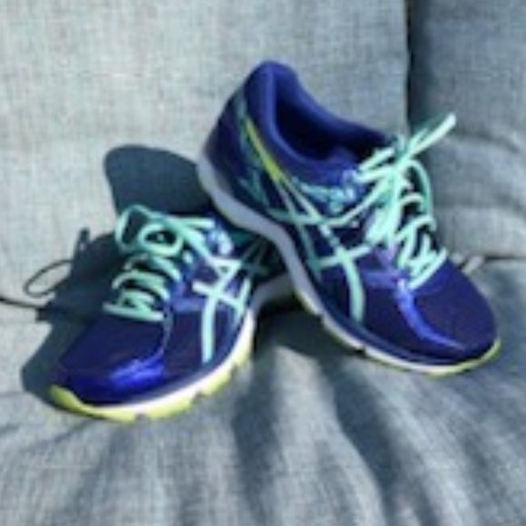 Beautiful blue Asics running shoe with turquoise and lime green accents. Gently worn only a few times, still perfect soles , interior & exterior