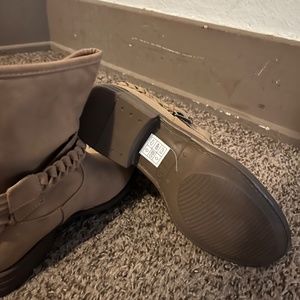 Women’s boots tan, suede like feel, size 7.5 brand new. The boots are not ankle boots but is a little taller. Purchased at Gordmans a store that is no longer in business in my area.