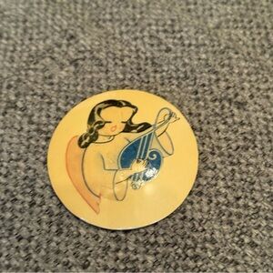 Approximately 2 1/4” round broach/pin with an angel, wings singing with a harp. Pre-owned. Black hair, with blue harp.