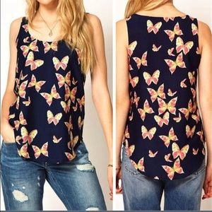 Super cute women's sleeveless blouse with different colored butterflies on it, it is navy blue made of chiffon. It is cute for summer as is or it can be worn with a sweater or cute denim jacket in fall