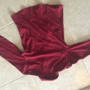 Red long sleeve button up shirt. It's a size L on the tag, but it does run small.