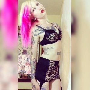 Women's worn cheetah print complete lingerie set, size Small, bra fits A-C, Leg Avenue brand, comes with Bra/high waisted bottom with garters/thong.