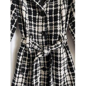 Shoulders 16 inches, chest 19 inches, around bust is 38 inches, waist 36 inches, 10-inch slit on back/bottom, 2 pockets on front, belt included, coat length is 34 inches, sleeve length is 25 inches.