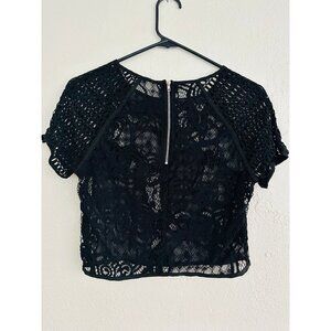 Women’s crop top small Black Crochet Lace sheer blouse shirt short sleeve zip up