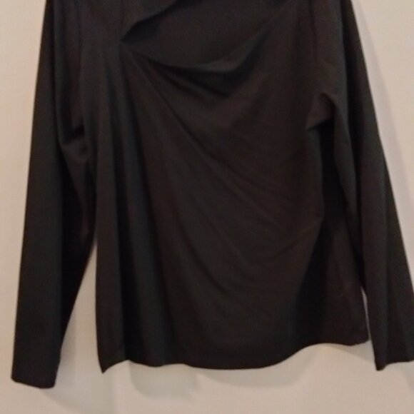 Women's cut out at the neckline and shoulder, black knit top. Beautiful drape across the front with medium stretchy knit fabric, polyester. Long sleeves, regular length around 25 -26" long, Banana Republic, size XL. Barely worn. Beautiful condition.