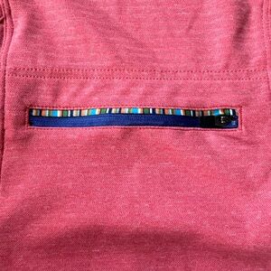 Back zipper pocket and two side pockets for keys or phone.