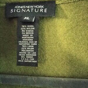 Bright olive green wool Signature Jones New York medium weight jacket. Contrast darker olive lined that contrasts when worn. Two large front pockets. Snap closure. Chest is 48", length is 32". Classic, understated, beautifully cut.