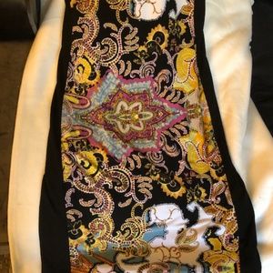 Beautiful multicolor panel on front and back, round neck, sleeveless dress with 5% spandex.