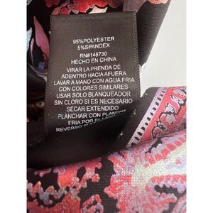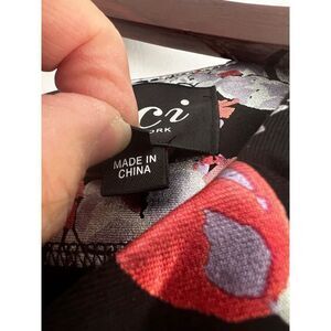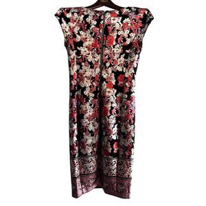 This is a pre-owned black floral print dress by eci New York. It is a size 6 and is made of 95% polyester and 5% spandex. The dress has a scoop neck, cap sleeves, and a fitted silhouette. It features a floral print with pink, red, white, and purple flowers on a black background. The hemline has a decorative border. The dress has a back zipper closure. The dress is in good condition with no visible signs of wear or damage.